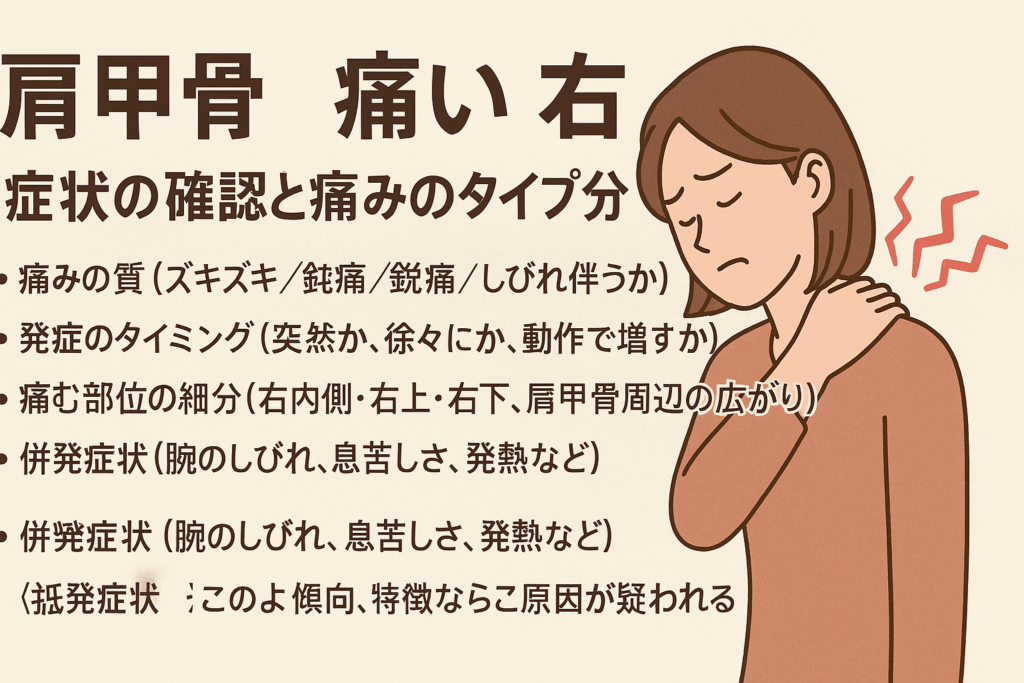 まずは、痛みのタイプを整理していきましょう。右側の肩甲骨あたりが痛むとき、「どんな痛みか」「いつ出るか」「どこが痛むか」「他に何か症状があるか」で、疑う原因が変わってきます。