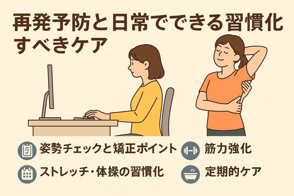 また、整体院や整骨院などで定期的に姿勢チェックを受けるのも、再発防止の一つの方法です。