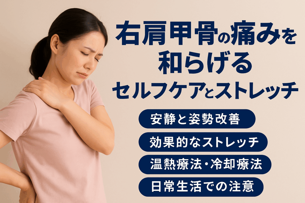 痛みを伴う右肩甲骨まわり。少しでもラクにしたいとき、自分でできるケア法を理解しておくと安心です。ここでは「安静・姿勢改善」「ストレッチ・運動例」「温熱/冷却」「筋膜リリース・軽マッサージ・筋力トレ」「日常の注意点」に分けて解説します。