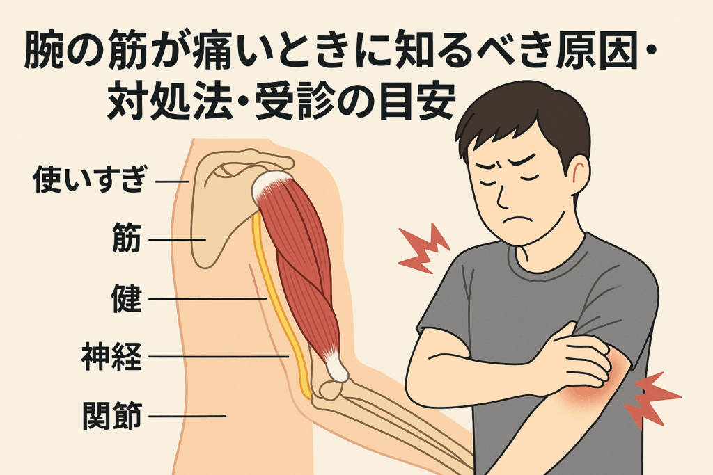 腕の筋が痛いと感じたら、使いすぎ・腱・神経・関節などあらゆる原因が考えられます。この記事では、痛みの出方から考えられる主な原因、セルフケア・ストレッチ、そして「受診すべきサイン」をわかりやすく解説します。