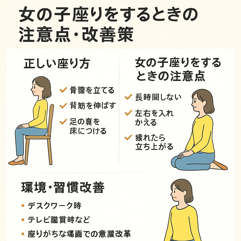 女の子座りで気になる骨盤のゆがみや姿勢悪化、むくみ・冷えの原因を分かりやすく解説。正しい座り方のポイントと簡単ストレッチ付きで、日々の習慣を見直すヒントがここに。