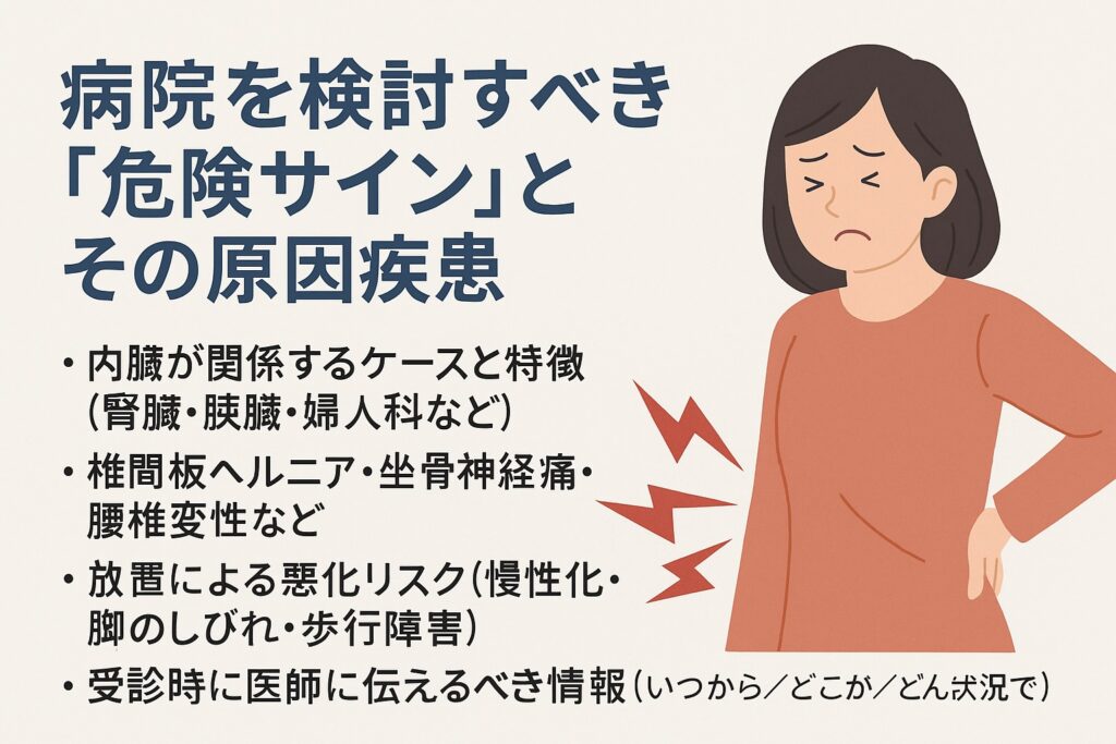 生理周期や体の冷え、更年期によるホルモンバランスの変化も影響するとされており、「腰だけでなく下腹部にも違和感がある」「発熱を伴う」場合には、早めの医療機関での確認がすすめられています。