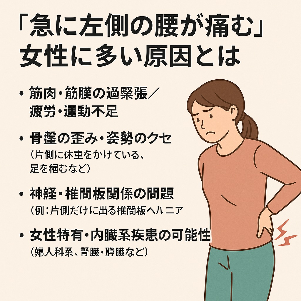 腰痛 左側 女性 急に痛みが出たら要チェック。女性に多い原因(骨盤の歪み・婦人科系・内臓疾患など)から、今日からできるセルフ対応法と「どんな場合に病院へ行くべきか」をわかりやすく説明します。