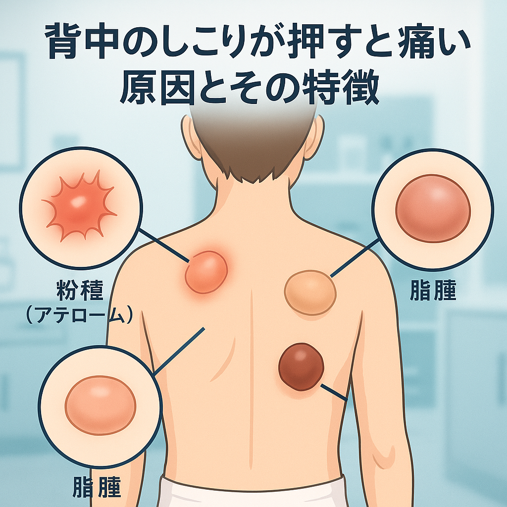 背中にできたしこりが押すと痛む場合、いくつかの原因が考えられると言われています。最も多いのは**粉瘤(アテローム)**と呼ばれる良性の皮下腫瘍で、皮膚の下に袋状の構造ができ、そこに皮脂や角質がたまることで生じます。通常は無痛ですが、細菌感染などで炎症を起こすと「押すと痛い」「赤く腫れる」「熱をもつ」などの症状が出ることが多いようです。
