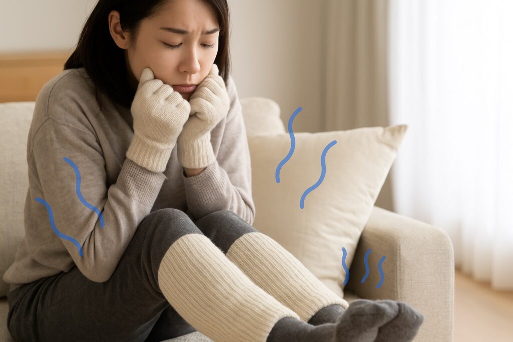 たとえば、「手袋をしても手のひらがひんやり」「靴下を履いても足先だけ冷える」「寝ているときに手足が冷えて目が覚める」といった状況は、末端冷え性の典型的なサインと言われています。
