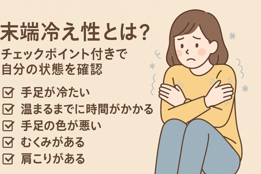 「末端冷え性で手先・足先がいつも冷たいあなたへ。原因(血行・筋肉・自律神経)をわかりやすく解説し、食事・運動・入浴・ツボなど今日から始められる改善法を詳しく紹介します。」