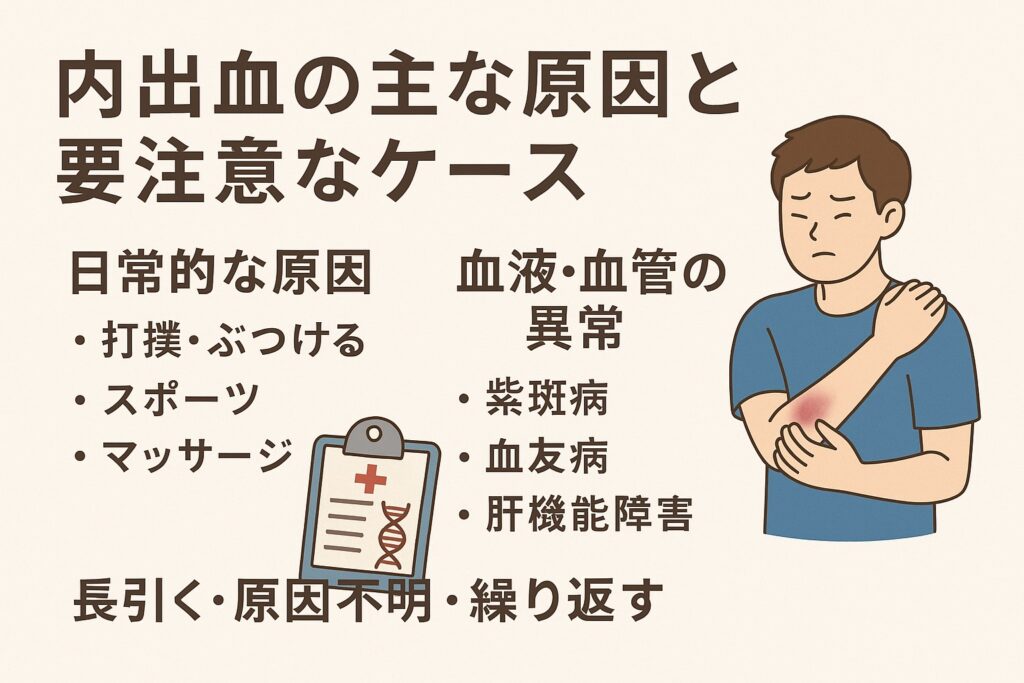 中には、単なる打撲ではなく、血液や血管、凝固機能の異常が原因で内出血が起きていることもあります。