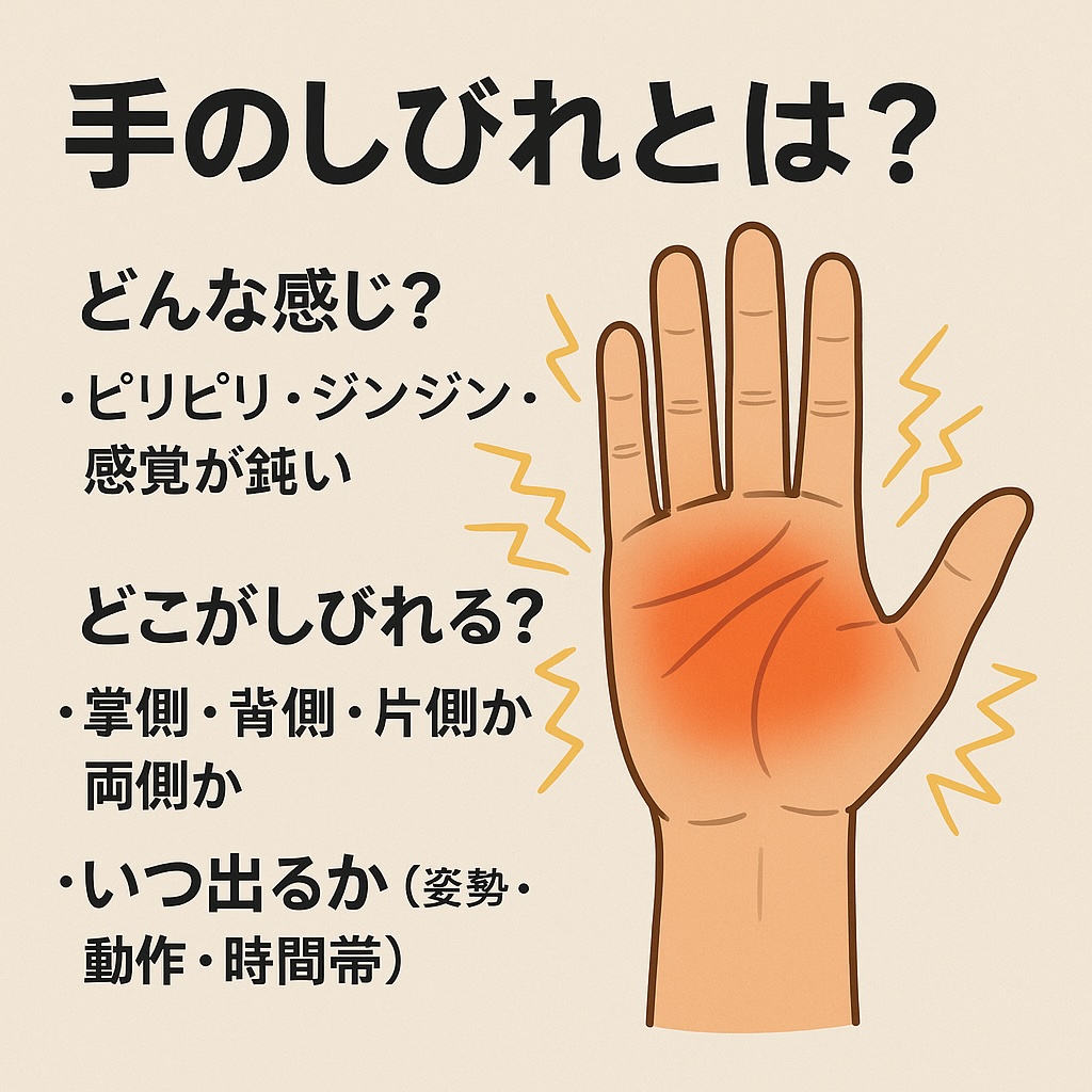 手のしびれが出たとき、「どんなふうに」「どこに」「いつ起きるか」を整理することが大切だと言われています。