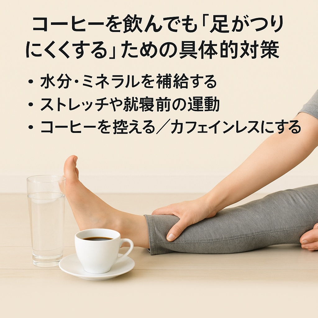 つまり、コーヒーを完全にやめる必要はなく、「水分・ミネラルを補う」「飲むタイミングを調整する」「体を整える」という3つの工夫を組み合わせることが、快適なコーヒー習慣と足の健康の両立につながると考えられています。