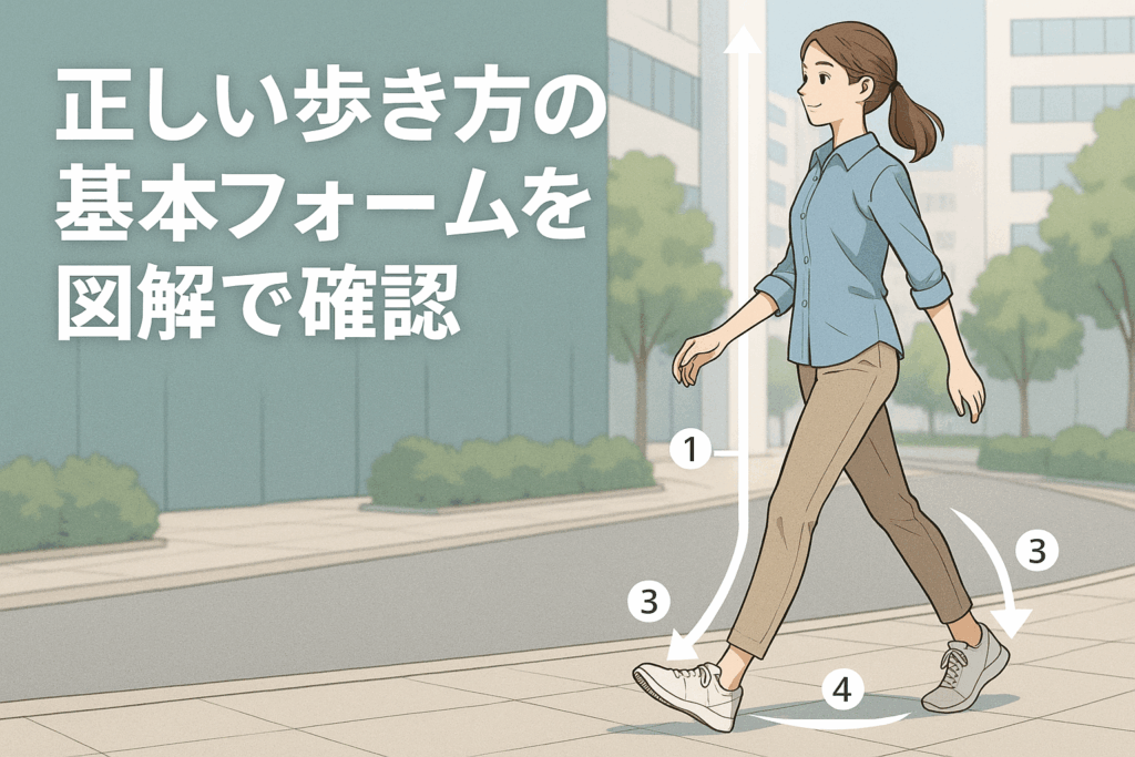 図で確認すると、①背筋を伸ばす → ②かかとから着地 → ③足裏全体 → ④つま先で蹴る、という4ステップでシンプル。実際に鏡やスマホ動画でフォームを見返してみると、改善のヒントが見つかるでしょう。