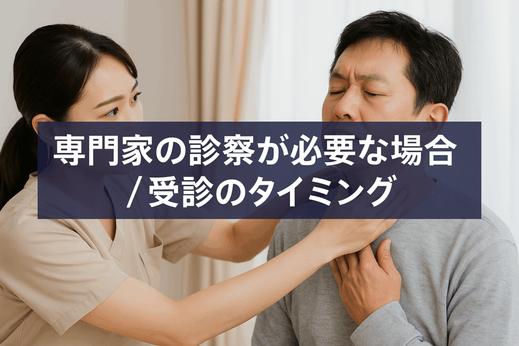 特に「咳が長引いている」「首を動かすと痛みが強い」「腕や背中まで痛む」「しびれを感じる」などが当てはまるときは、自己判断せずに専門家への相談がすすめられています。