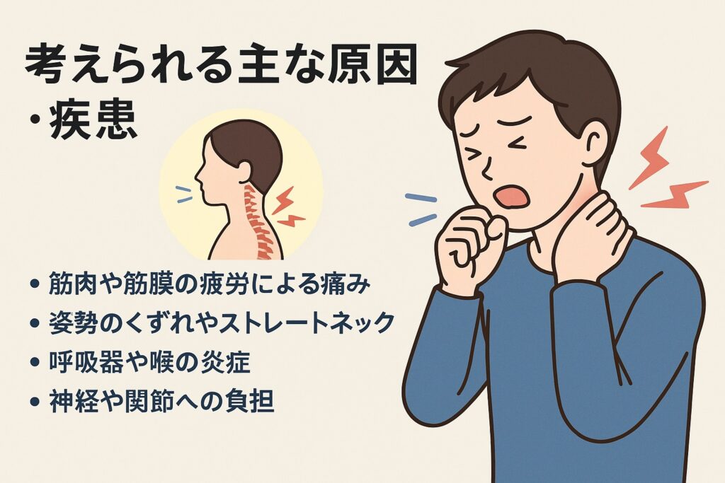 また、咳き込みすぎて肋骨や頚椎周囲にストレスがかかり、筋膜や神経が刺激を受けるケースもあるとされています。呼吸が苦しい、息を吸うと首の痛みが強くなる場合なども、内科で確認すると安心です。