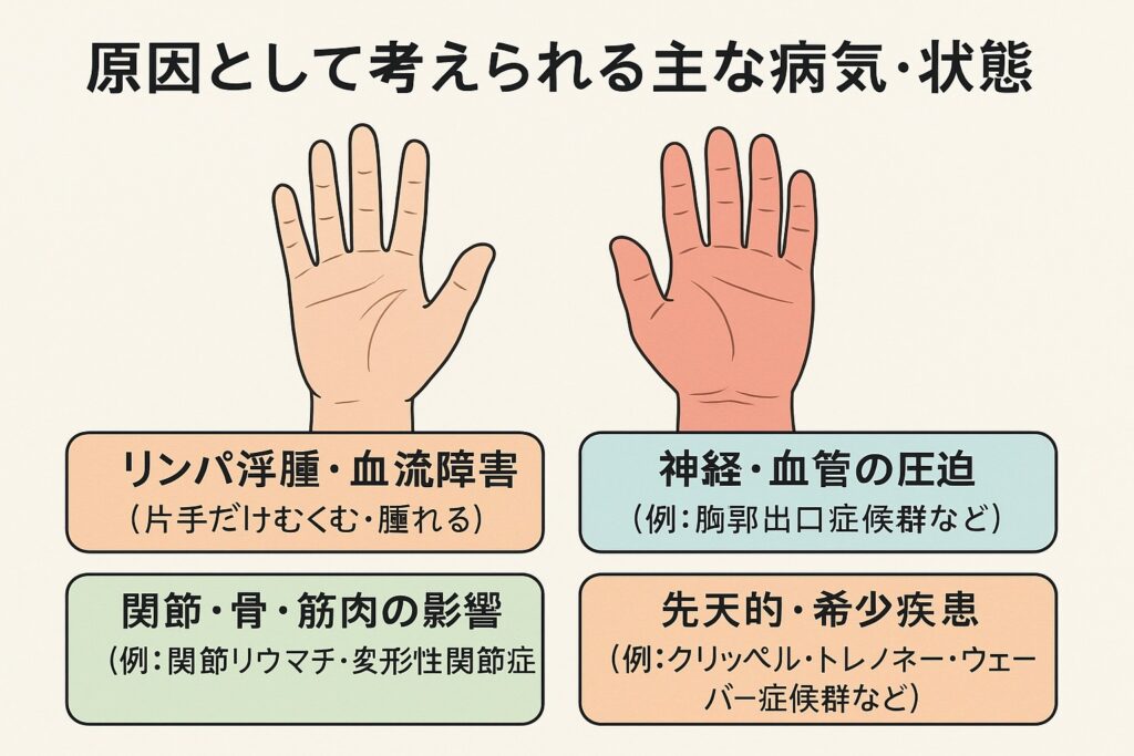 手の大きさに明らかな左右差が出ている場合、生活習慣だけでなく、体の中で何らかの異常が関係していることもあると言われています。ここでは、代表的な原因として考えられる病気や状態を紹介します。あくまで“可能性”の一つとして参考にし、症状が続く場合は早めの相談がすすめられています。