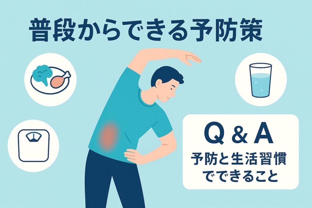 1 普段からできる予防策:正しい姿勢・定期的なストレッチ/筋トレ・体重管理・脂肪分控えめ・水分排尿ケア