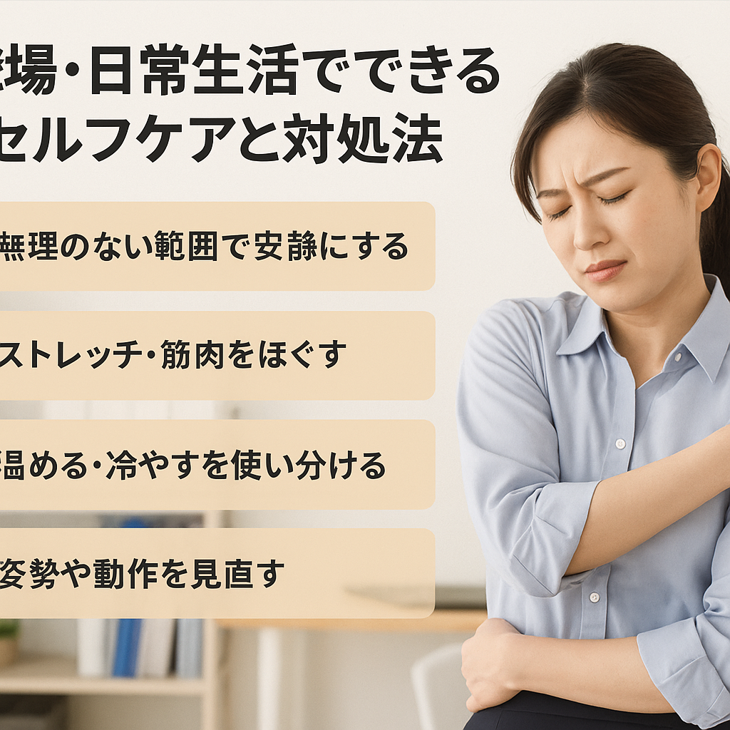 「上腕が痛い」と感じても、すぐに仕事を休めない方は多いですよね。実は、職場や家庭でも無理なくできるセルフケアを取り入れることで、負担をやわらげることができると言われています。