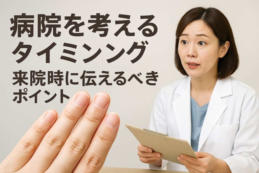 「爪のへこみくらいで病院に行くべき?」と迷う方も多いと思います。実際、軽度のへこみはストレスや生活リズムの乱れが原因で一時的に出ることもありますが、変化が続く場合は体のサインであることもあるそうです。ここでは、来院の目安や伝えておきたいチェックポイントを紹介します。