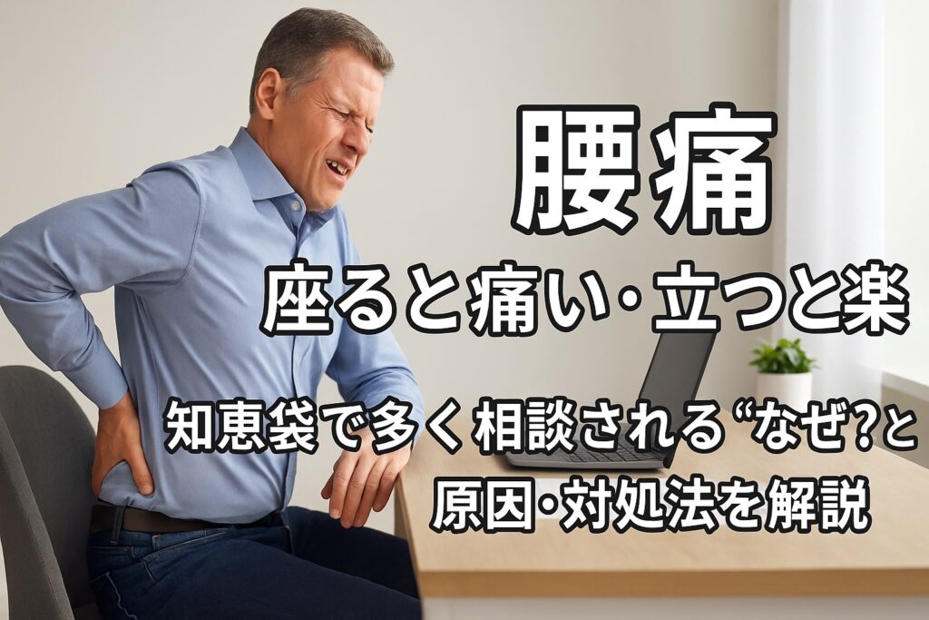 腰痛 座ると痛い・立つと楽な症状に悩んでいませんか?知恵袋でも寄せられるこの“立つとラクなのに座ると痛む”現象の原因・チェックポイント・セルフケア・受診目安を整形外科・整体の視点からわかりやすく解説します。