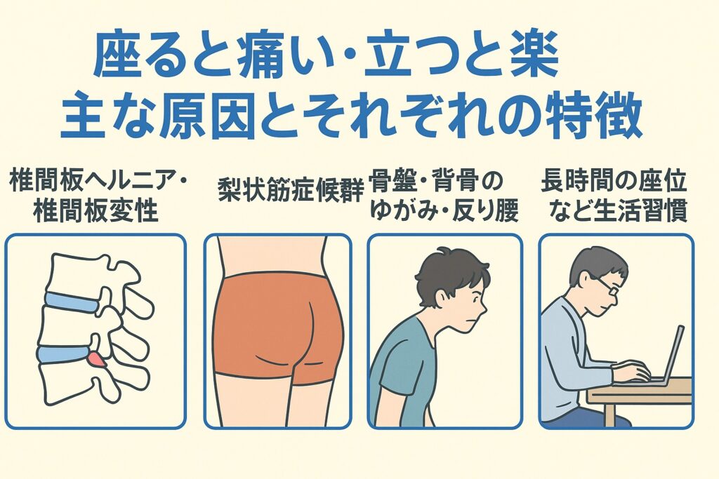 「座ると痛くて、立つと楽になる腰痛」は、いくつかの異なる原因が関係していると言われています。代表的なケースを5つに分けて紹介します。どれも共通して“座位で神経や筋肉が圧迫されやすい状態”が背景にあるそうです。