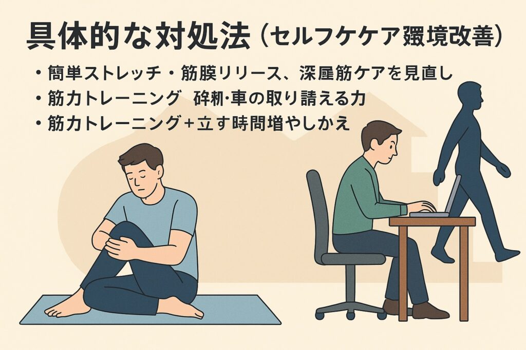 筋力トレーニング(体幹・殿筋・股関節)+日常動作の工夫(立つ時間を増やす)
