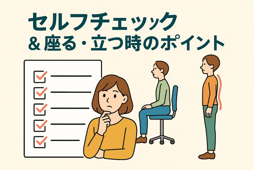 腰痛の原因を知ったうえで、まず行いたいのが「自分の体の状態を把握すること」です。ここでは、日常の中で簡単にできるセルフチェックと、座り方・立ち方のポイントを紹介します。ほんの少し意識を変えるだけでも、痛みの感じ方が違うといわれています。