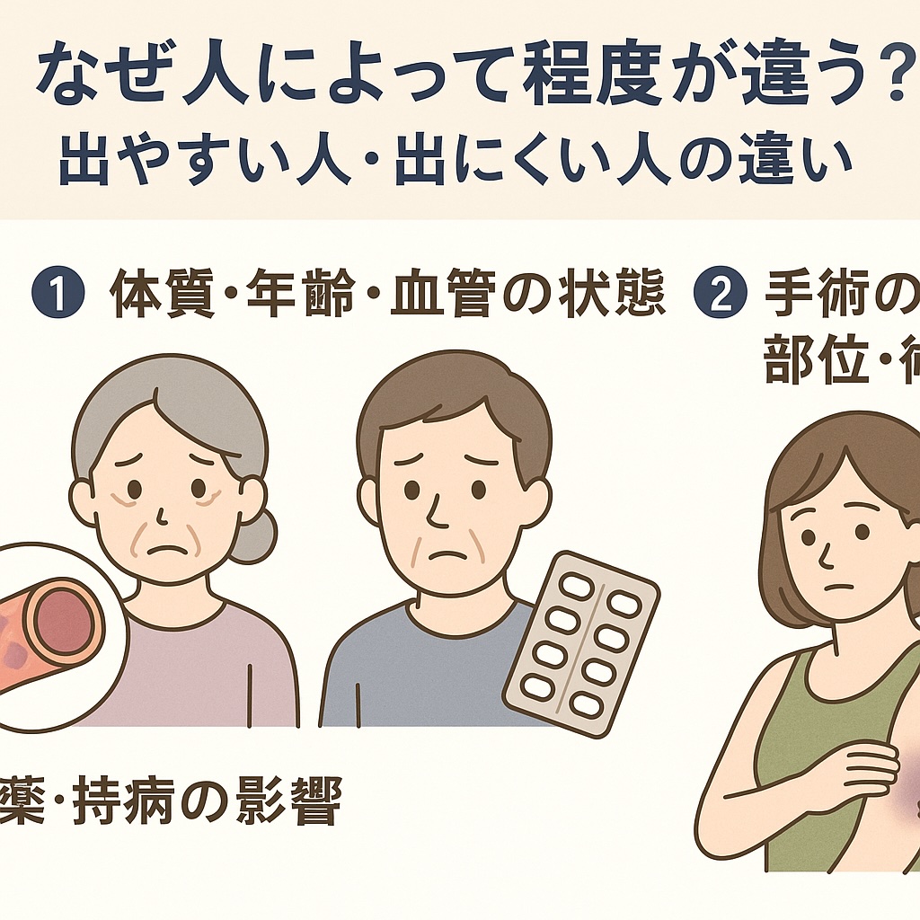 同じ手術を受けても「自分だけあざが強く出た」「友人はほとんど出なかった」という経験をする方もいます。実は、内出血の出やすさには体質や血管の状態、服薬、手術内容など複数の要因が関係していると言われています。ここではその違いを順に見ていきましょう。