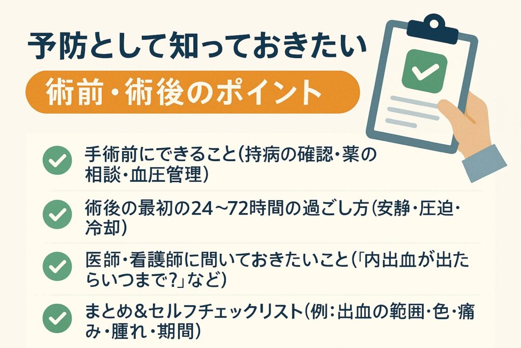 内出血を完全に防ぐことは難しいですが、手術前後のちょっとした工夫でリスクを減らせると言われています。手術の前に体の状態を整え、術後は適切に過ごすことが、回復をスムーズにする鍵になるそうです。ここでは、事前にできる準備と、術後の注意ポイントを紹介します。