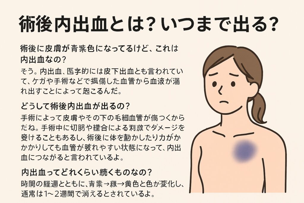 術後 内出血 なぜ発生するのかを分かりやすく解説。手術直後の青あざの仕組みから、回復を早めるセルフケア、注意すべきサインまでをまとめています。術後の不安を軽くしたい方におすすめです。