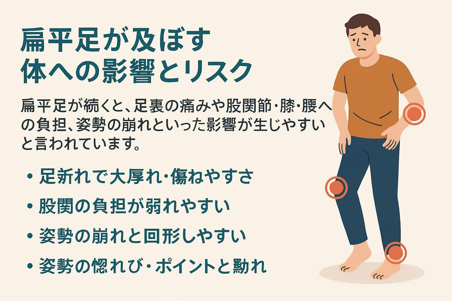 アーチが体重の衝撃を分散しづらくなるため、歩くたびに負荷が蓄積しやすいとされています。 - 膝や股関節の負担が増えやすい