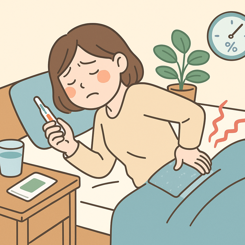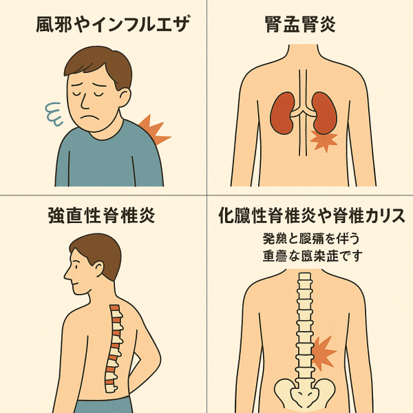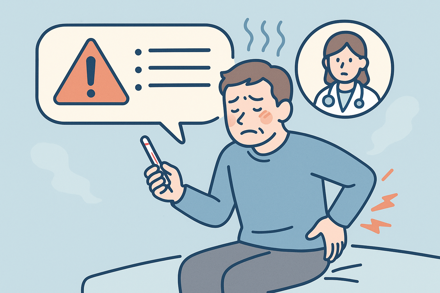 ただし注意点として、こうした“発熱+腰痛”は多くの場合、一過性で、体の防御反応が落ち着けば改善すると言われています。しかし、片側だけの強い痛み、排尿時の違和感・血尿、痛みが数日たっても引かないなどがある場合は、内臓の感染(例:腎臓や背骨の近くの感染)といった重い可能性も否定できません。後ほど「受診の目安」の項で紹介するので、覚えておいてください。