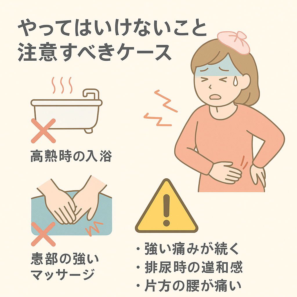 「痛いから揉めば改善する気がする」と思う方もいますが、発熱時の強いマッサージはかえって炎症を刺激する可能性があるとも指摘されています。また、腰の痛みが数日引かない、片側だけズキッと響く、排尿時の違和感がある場合は異なる原因の可能性があり、来院を検討すべきとも言われています。