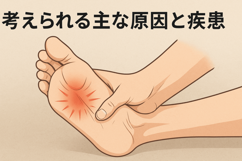 足の裏に「刺すような痛み」を感じると、つい不安になってしまう方も多いのではないでしょうか。実際、この痛みにはいくつかの代表的な原因が関係していると言われています。ただ、見た目に変化がない場合も多く、本人も気付かないうちに負担をため込んでしまうことがあるそうです。ここでは、足裏の刺すような痛みと結びつきやすい疾患や仕組みについて、できるだけ分かりやすく整理していきます。「どれに当てはまるのか知りたい」という方は、読み進めながら自分の症状と照らし合わせてみてくださいね。
