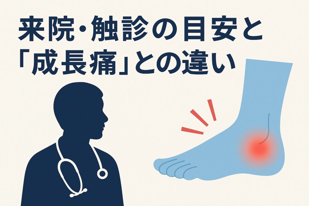 **来院の目安は「痛みが長引く」「歩行に影響が出ている」「押すと痛む」**といった具体的な変化の有無と言われています。成長痛との違いを理解しておくことで、状況に応じた判断がしやすくなります。子どものかかと痛は、そのままにしておくより「必要なタイミングで相談する」という意識が安心につながると言えそうです。