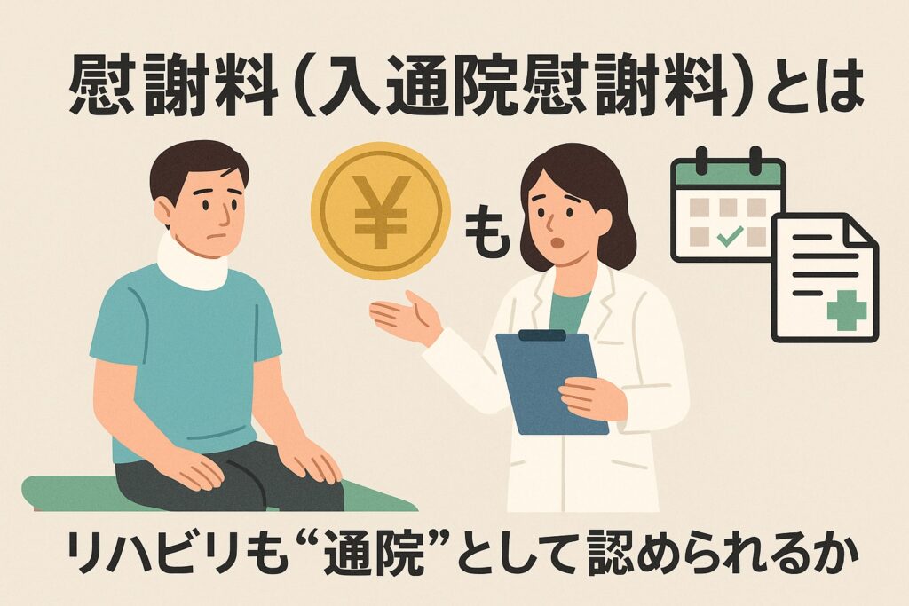 入通院慰謝料とは、事故によって日常生活が制限され、精神的負担が生じたことに対して支払われる補償のことです。リハビリに通う行為も時間・労力が必要になるため、「通院」と同一の扱いになるケースが一般的だと解説されています(引用元:ひびき法律事務所 https://hibiki-law.or.jp/jiko/isharyo/33753/)。
