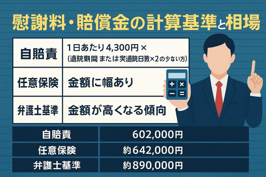 3.慰謝料・賠償金の計算基準と相場:自賠責/任意保険/弁護士基準の違い