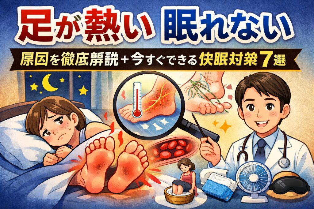 足が熱い 眠れない のはなぜ?夜に足先がほてって寝つけない原因(自律神経・血行不良・病気の可能性など)を専門家見解で分かりやすく解説し、すぐに試せる快眠対策を紹介します。続く症状の場合の受診目安も掲載。 【1.足が熱くて眠れないってどんな状態... -