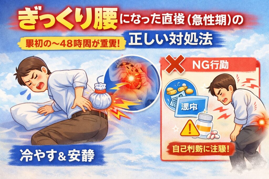 ぎっくり腰を起こした直後、多くの人がまず戸惑います。発症からおおよそ**〜48時間急性期(激痛期)**と呼ばれ、この時期の過ごし方が、その後の改善スピードに影響すると言われています。