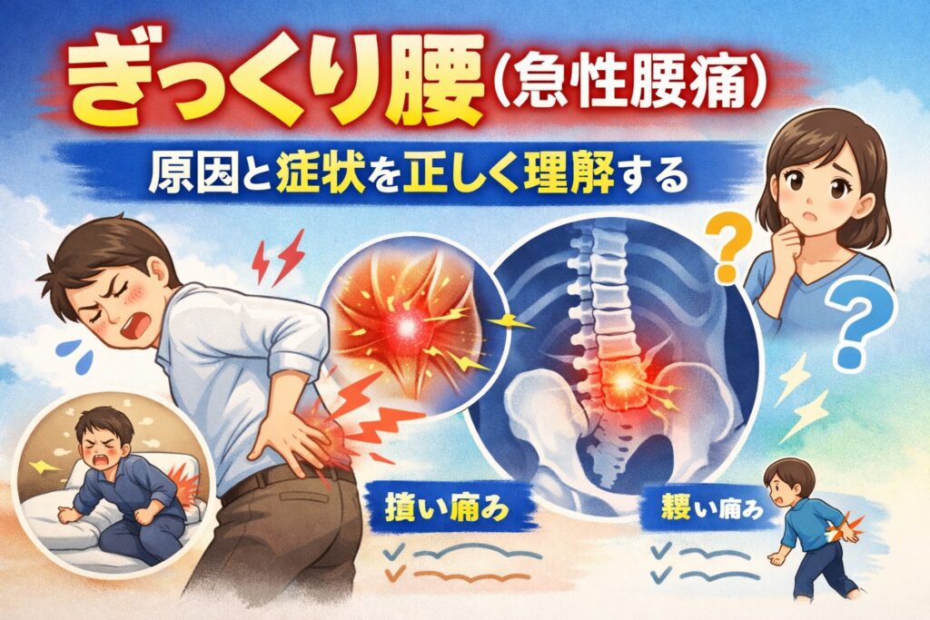 そんな経験から検索している方も多いと思います。いわゆるぎっくり腰は、正式には急性腰痛症と呼ばれ、ある日突然起こる強い腰の痛みを指す言葉です。