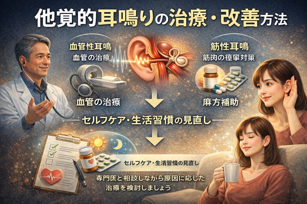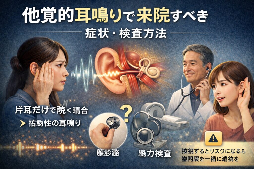 「気のせいかも」と一人で抱え込まず、客観的に確認できる余地がある点は、他覚的耳鳴りならではの特徴と言えるでしょう。
