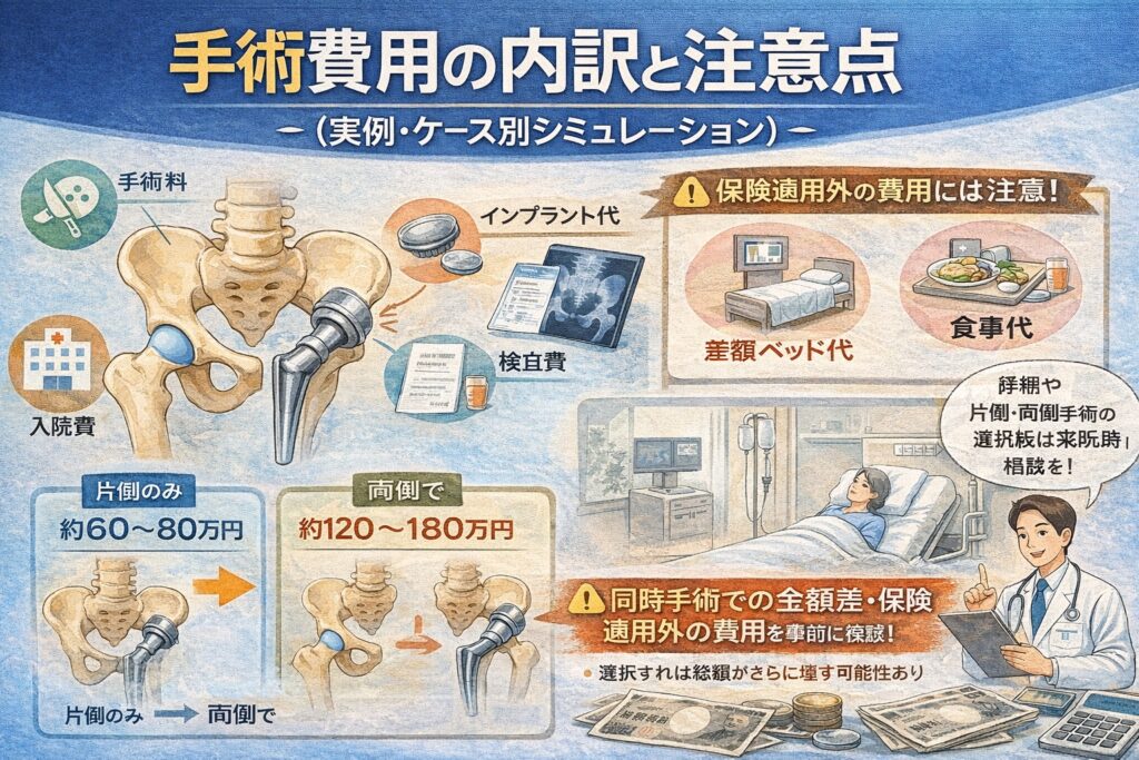 入院期間の長さ、追加検査の有無、麻酔方法などによって、費用に差が出る場合があると言われています。また、片側だけでなく両側の股関節を手術する場合は、総額がさらに高くなるケースもあるとされています。