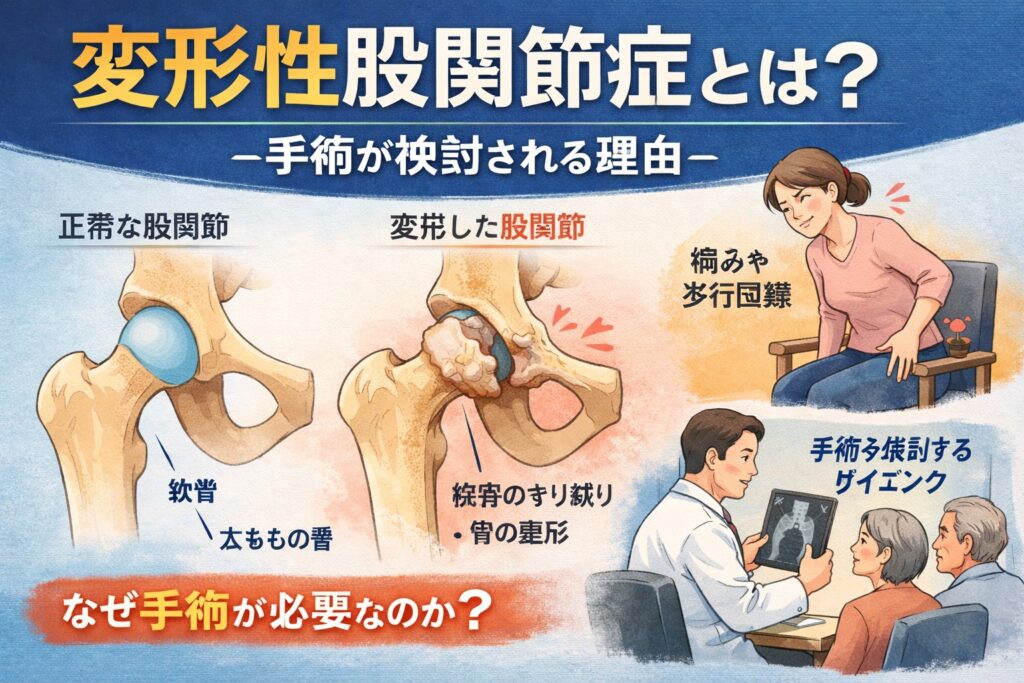 変形性股関節症は、進行度によって検査や施術の選択肢が変わると言われています。そのため、まずはどんな病気で、なぜ手術が検討されるのかを理解しておくことが大切だと考えられています。