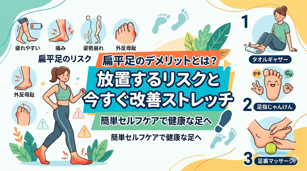 扁平足のデメリットを詳しく解説します。足裏のアーチが消失すると、疲れやすくなるだけでなく、外反母趾や膝痛、腰痛の原因にもなります。本記事では扁平足のリスクから、自宅で簡単にできるチェック法、効果的な改善トレーニングまで紹介。足の健康を取り戻しましょう。