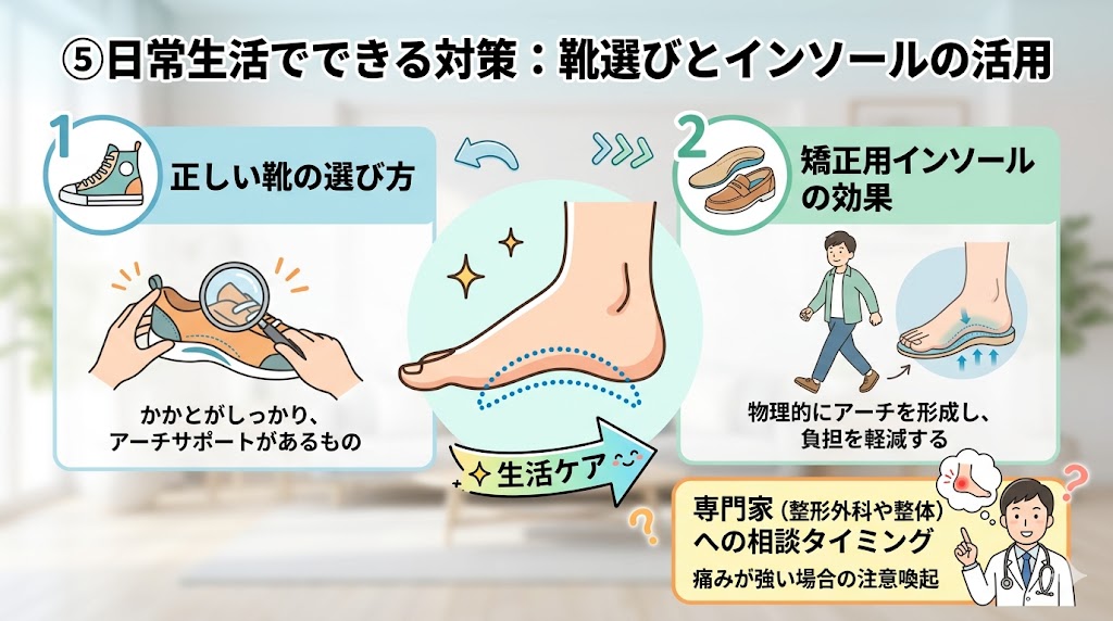⑤ 日常生活でできる対策:靴選びとインソールの活用