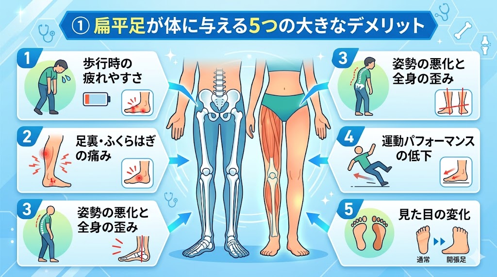 実は、扁平足は単に足の裏が平らなだけではなく、放っておくと体全体にさまざまなトラブルを引き起こす可能性があるんです。ここでは、特に注意したい5つのデメリットについて、プロの視点からお話ししますね。