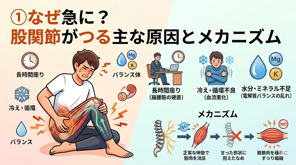 ① なぜ急に?股関節がつる主な原因とメカニズム