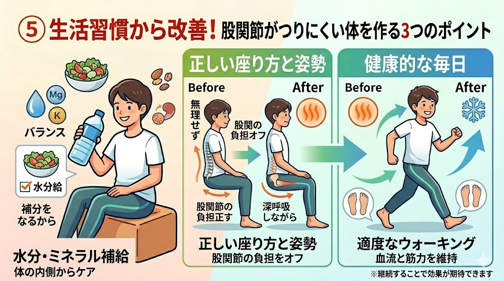 ⑤ 生活習慣から改善!股関節がつりにくい体を作る3つのポイント