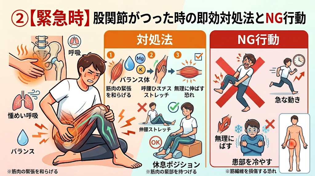 ② 【緊急時】股関節がつった時の即効対処法とNG行動