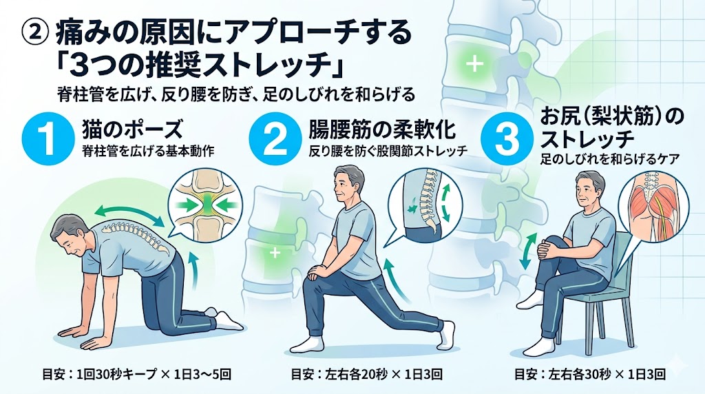 ② 痛みの原因にアプローチする「3つの推奨ストレッチ」