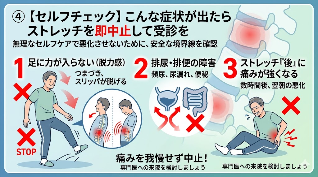 ④ 【セルフチェック】こんな症状が出たらストレッチを即中止して受診を