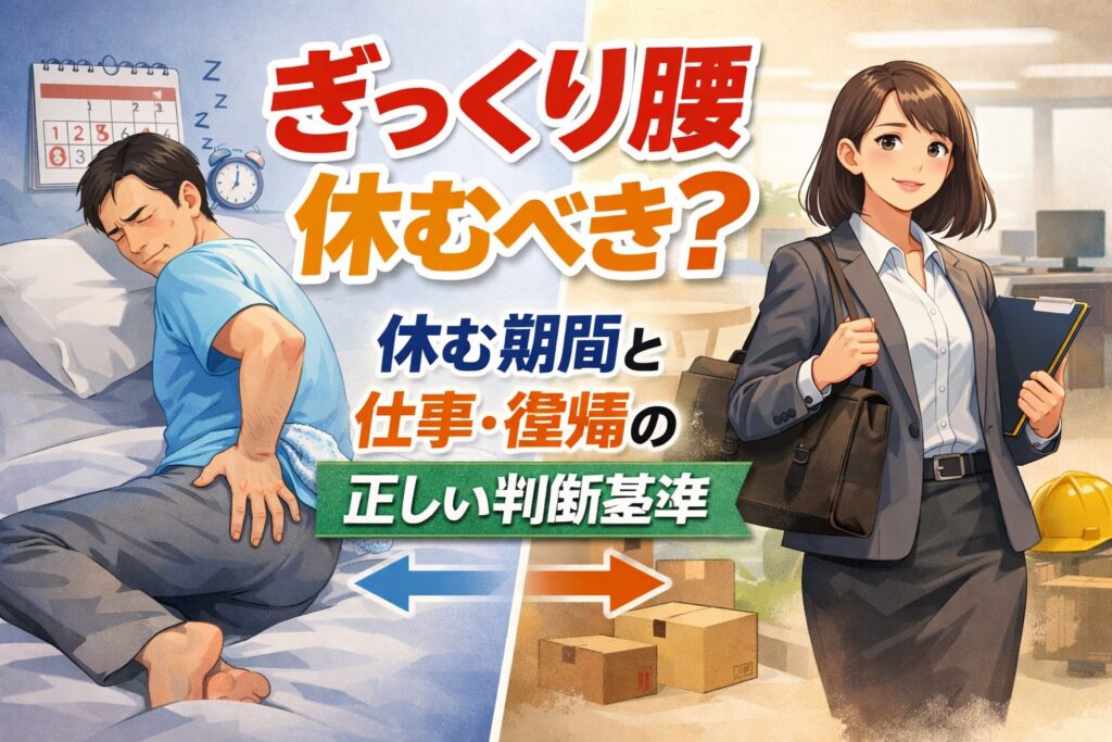 ぎっくり腰 休む際のポイントを徹底解説。休むべきかの判断基準、症状別休養期間、仕事への影響・会社への連絡方法、復帰目安まで解説します。痛みを悪化させない過ごし方も紹介。 【1.ぎっくり腰で休むべきか?まずは判断基準から】 「ぎっくり腰になった... -