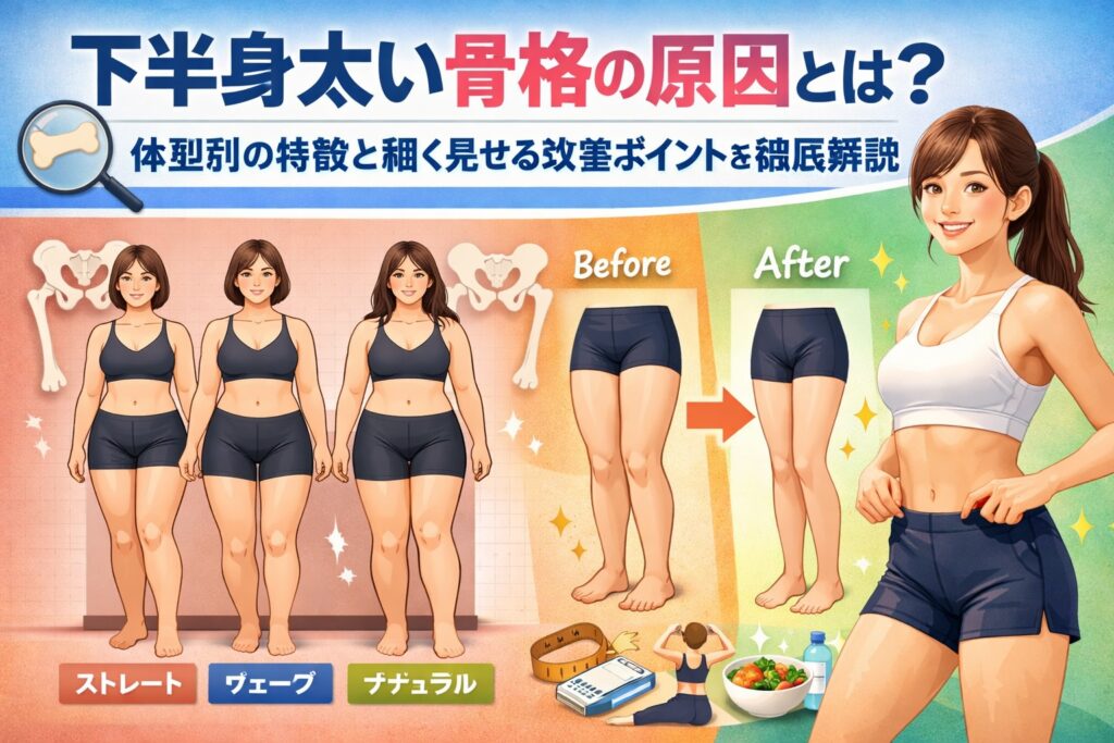 下半身太い骨格に悩む人向けに、骨格タイプ別の特徴・太く見える原因・今日からできる改善策をわかりやすく解説。体型のせいと諦める前にチェック。 【1.下半身が太く見えるのは「骨格」が原因なの?】 そもそも「骨格」とは何を指すのか 「下半身が太いの... -